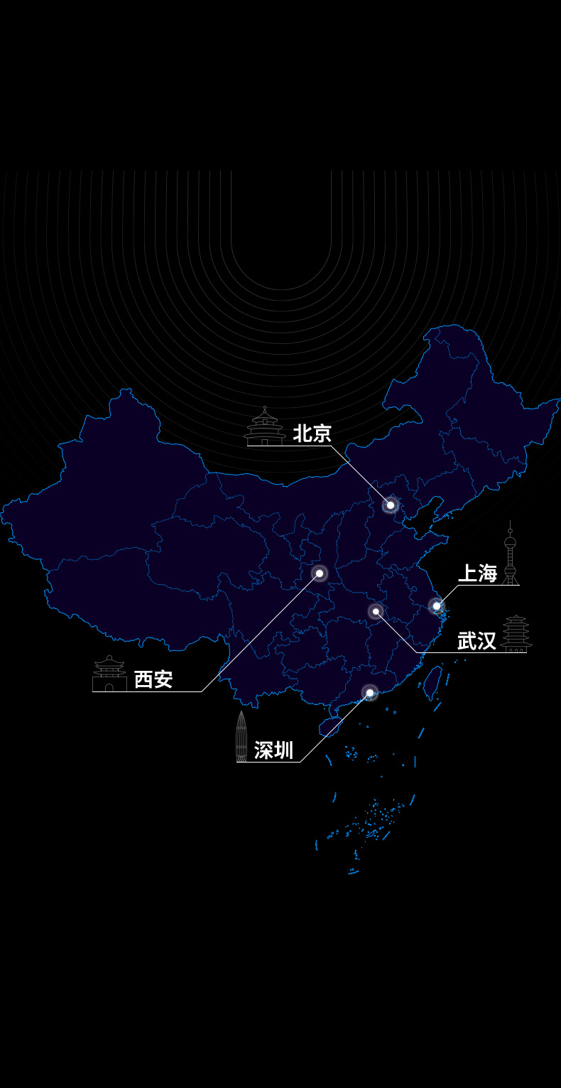 分布在北京、上海、武汉、深圳、西安。