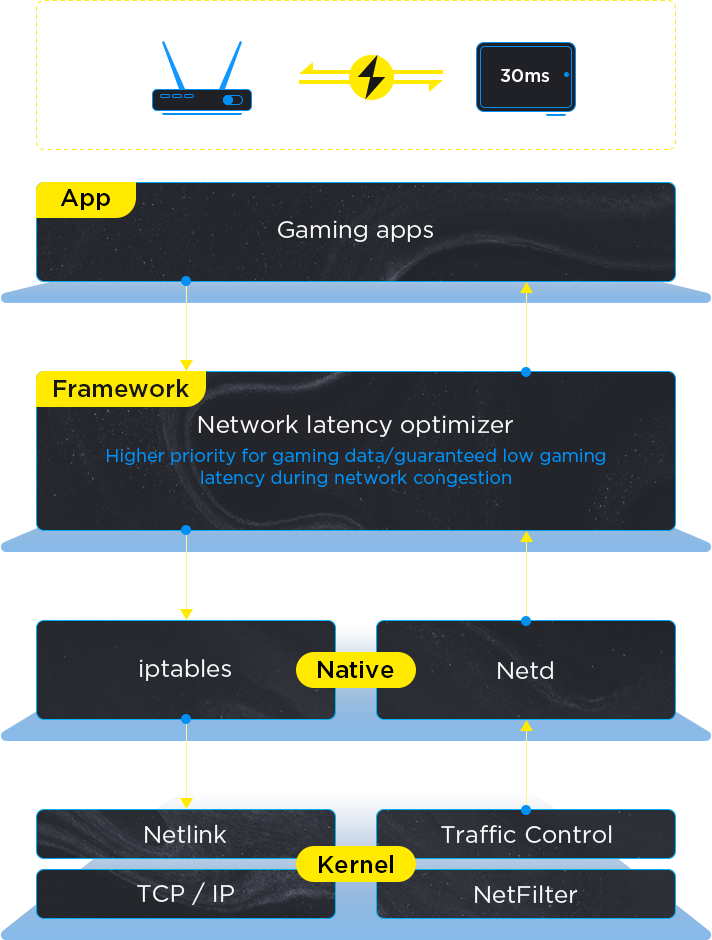 A built-in mechanism for real-time data link quality detection and evaluation dynamically allocates more network resources to gaming apps when network congestion is detected to ensure a smooth gaming experience.