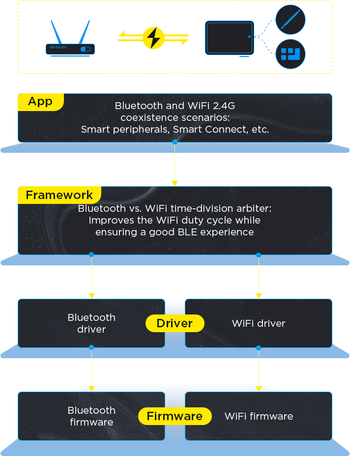 When BLE and WiFi 2.4G operate simultaneously, an optimized solution manages resource conflicts, improving WiFi data throughput while maintaining low power consumption and low latency for Bluetooth devices such as pens, keyboards, and controllers.