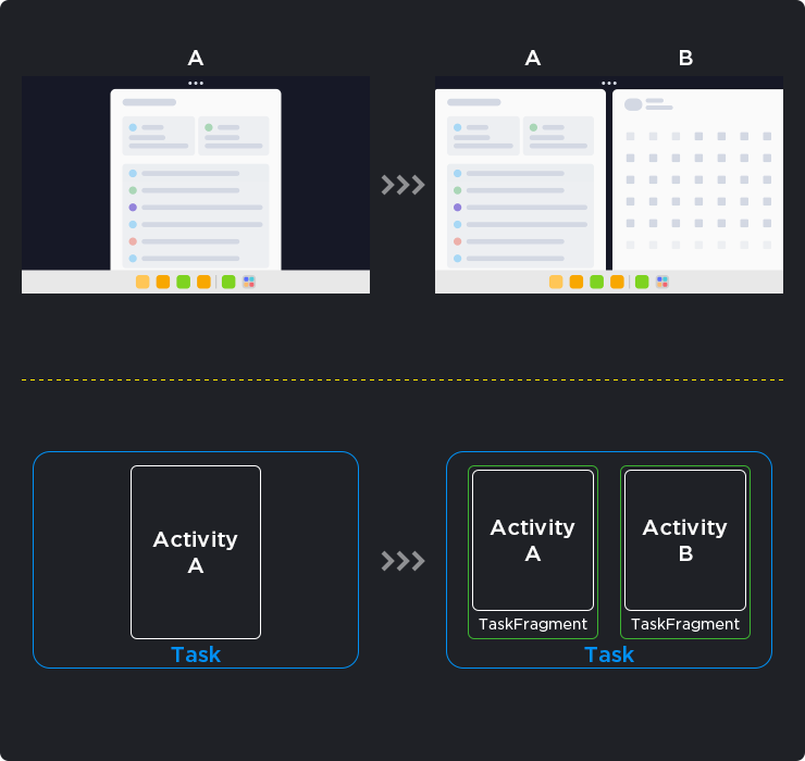 Management rules are implemented in the app to display different activities of the same app side by side in the same interface.