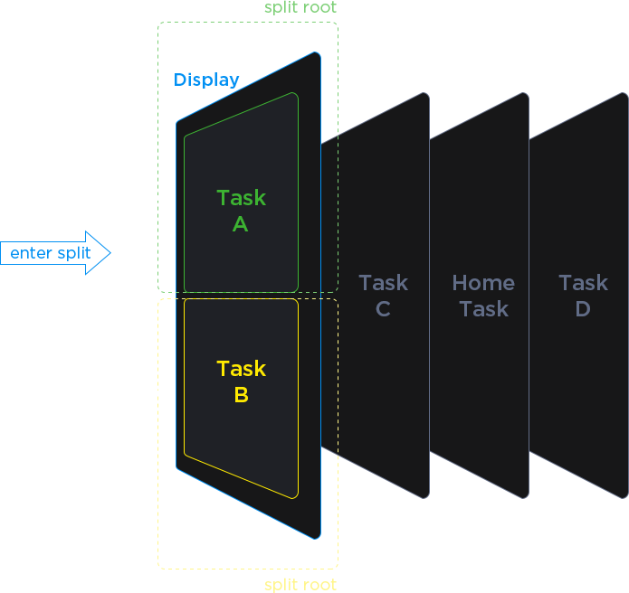 Different task stacks and corresponding display areas are created for split-screen apps so that multiple apps can be displayed and run.